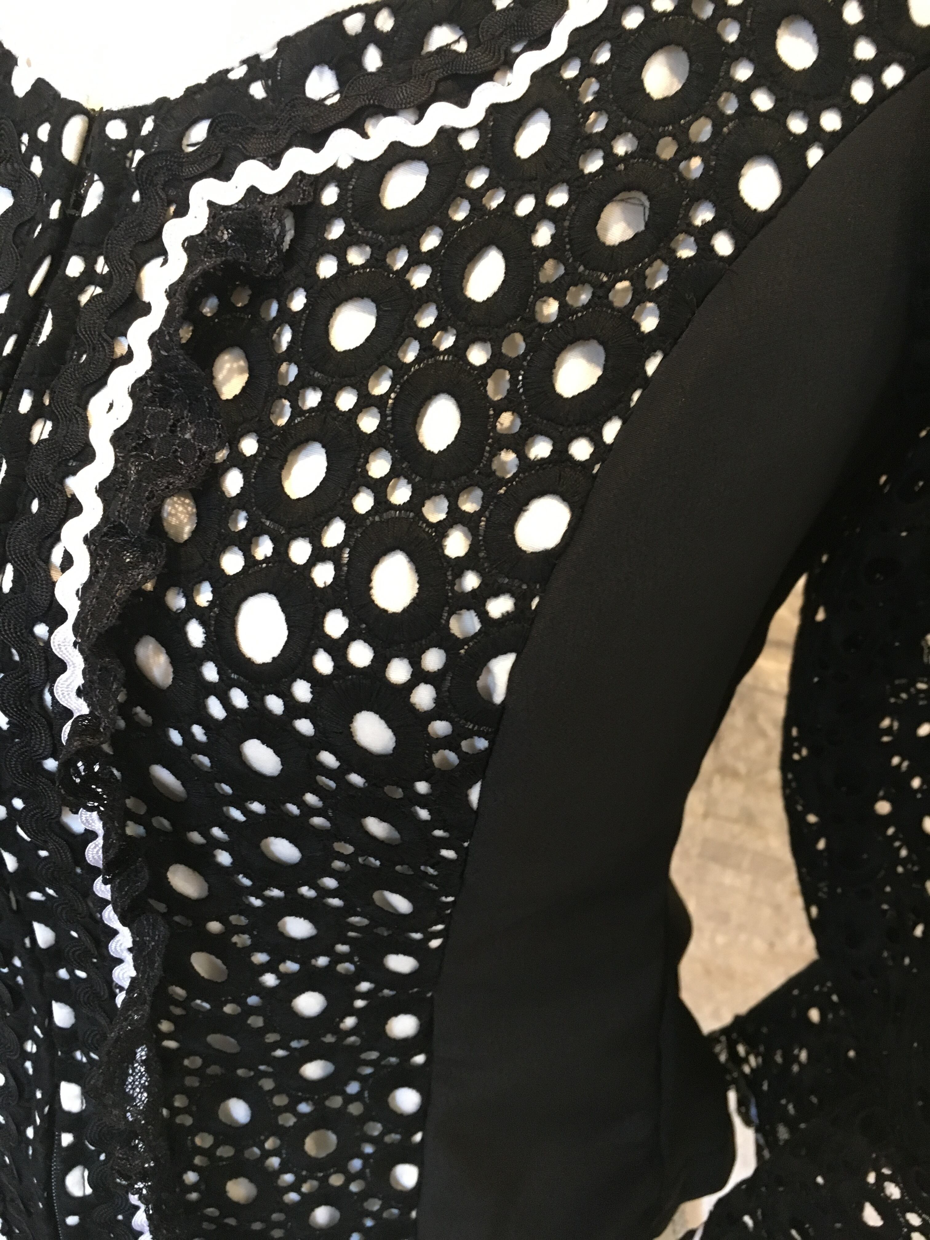 黒色ですが、サークルレース生地に白色で裏打ちしてますので、明るい印象のブラウスになります。