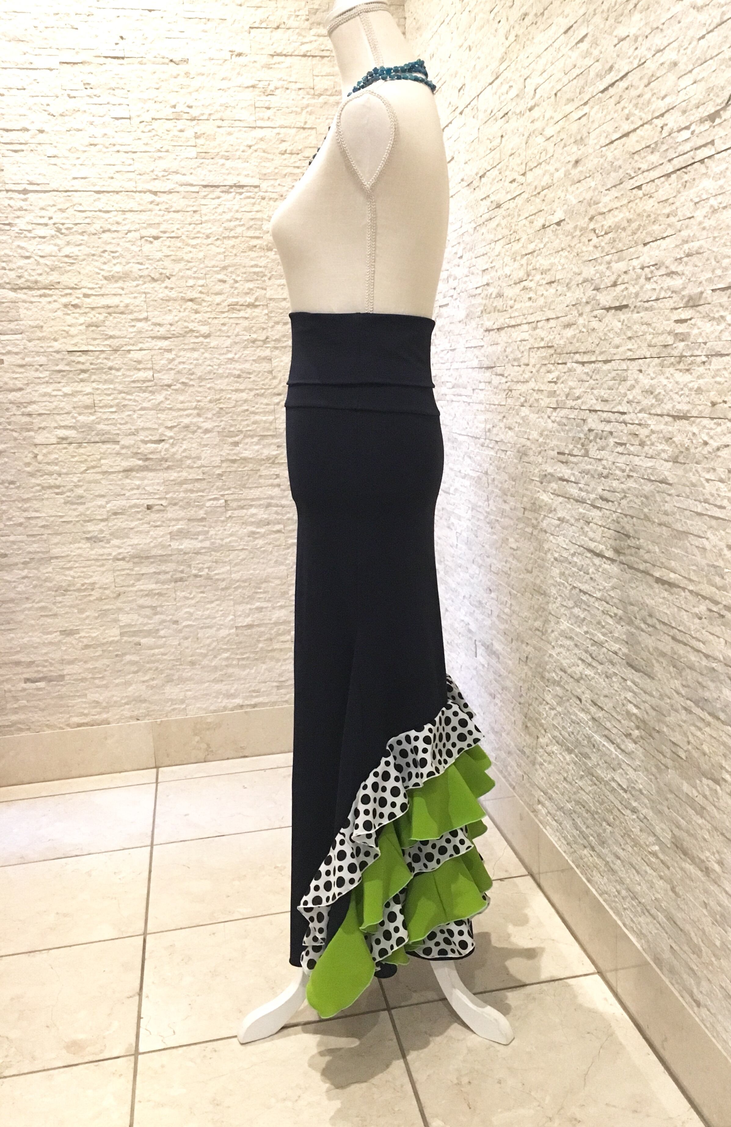 濃紺のストレッチ生地にフリルを付けてます。