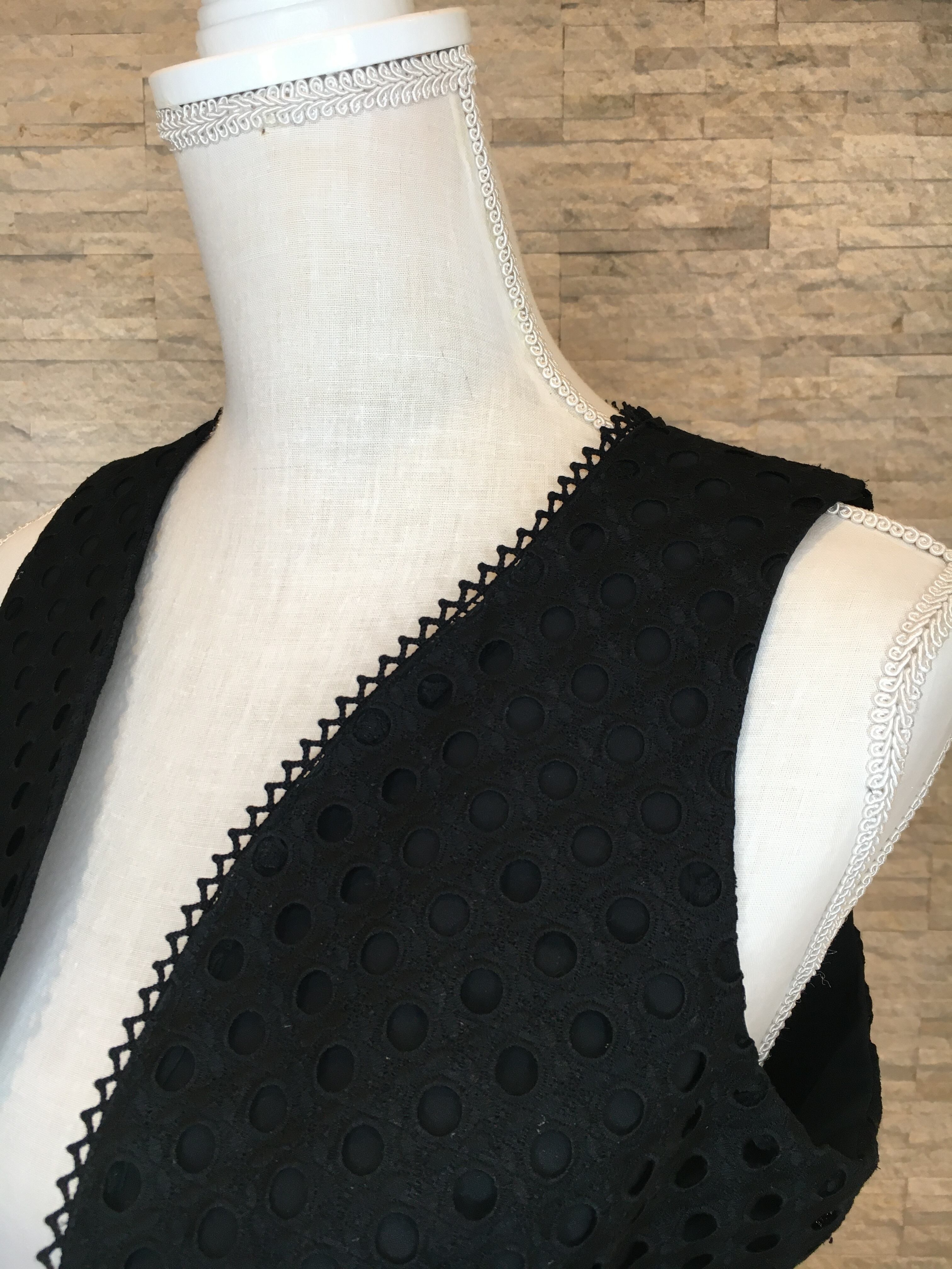 袖ぐり以外の部分には、レースのブレードを飾っています。