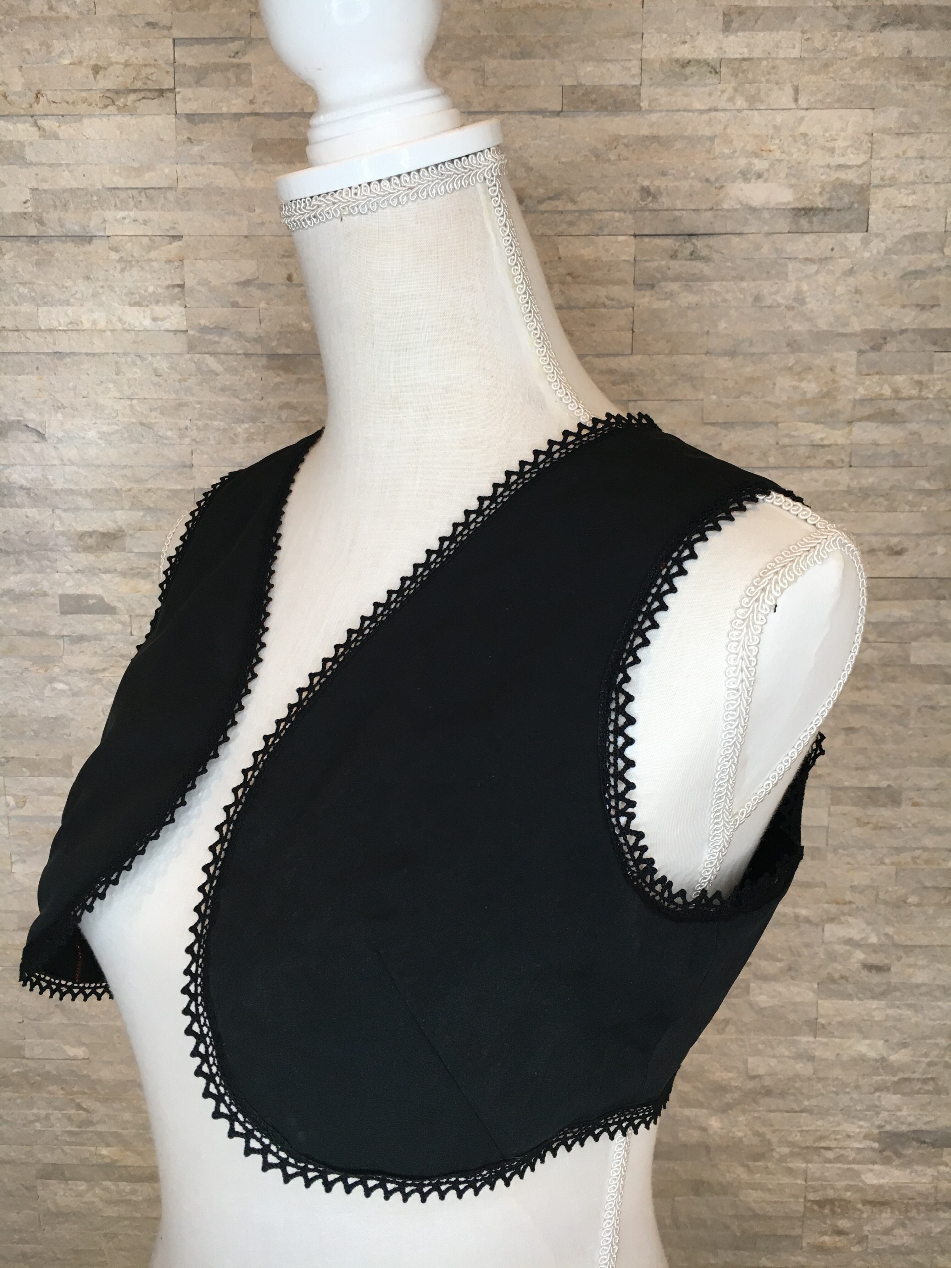 袖ぐり、襟周囲全て黒色レースブレードで飾っていますので、近くで見ても素敵ですよ!
