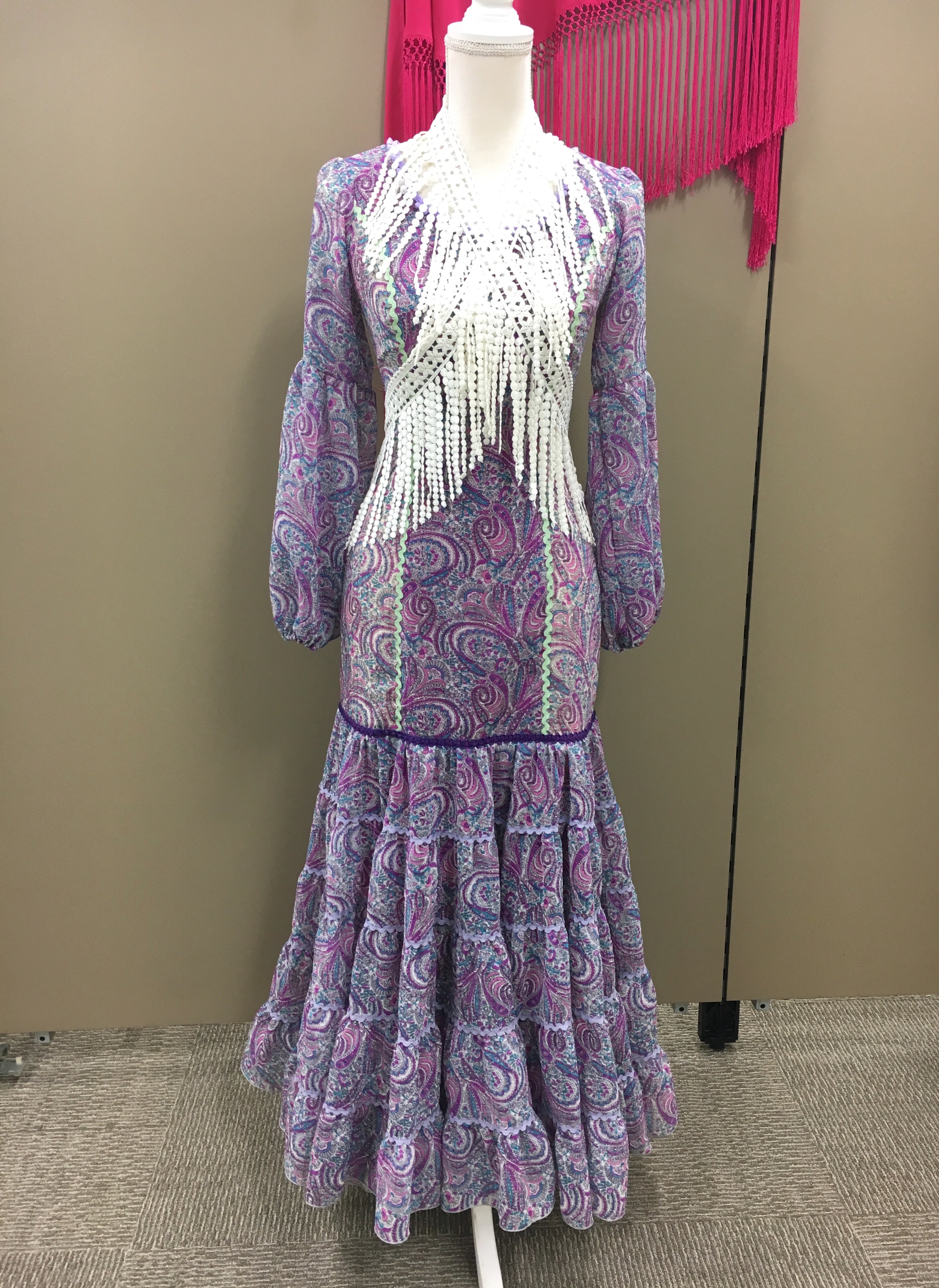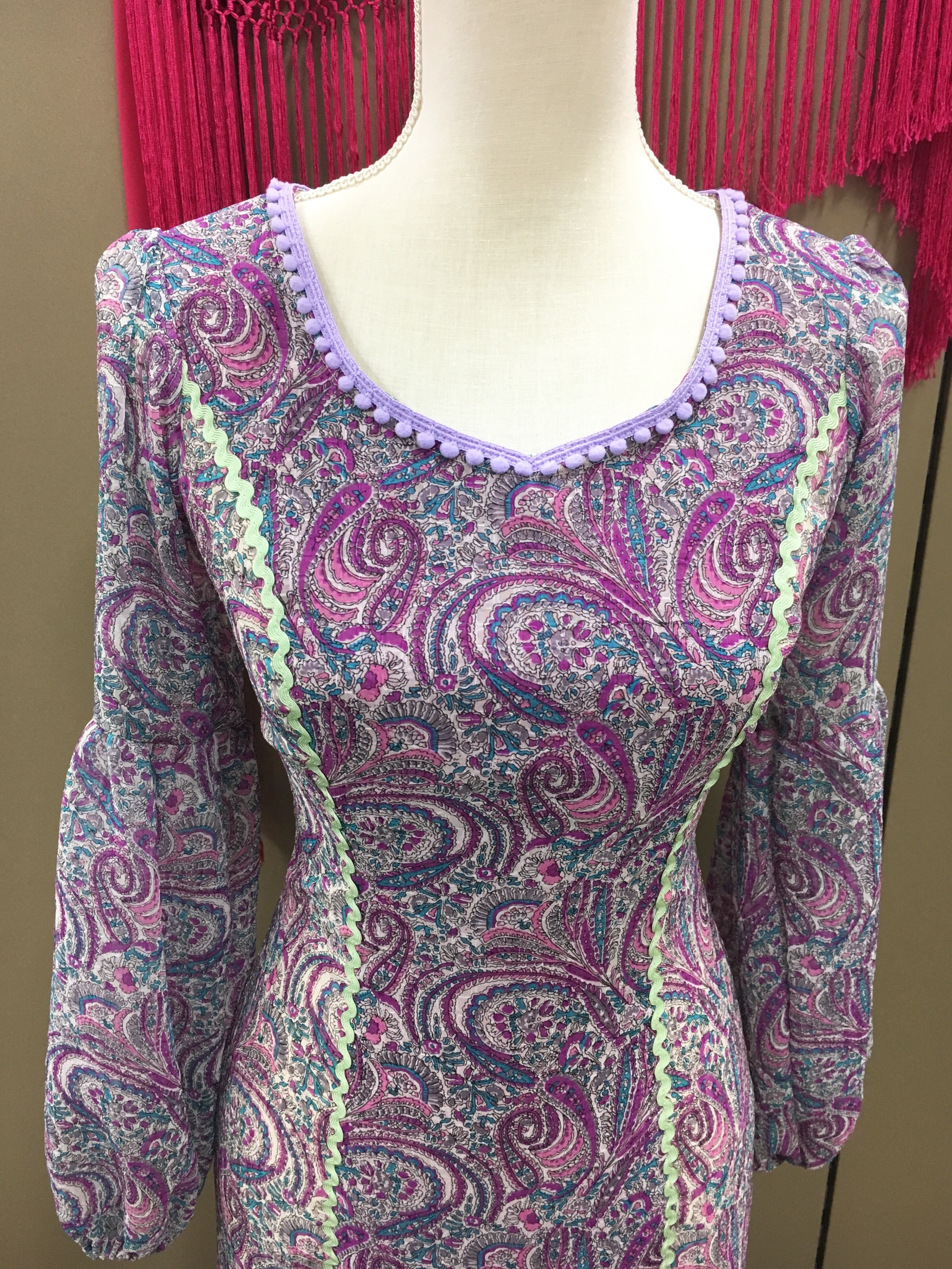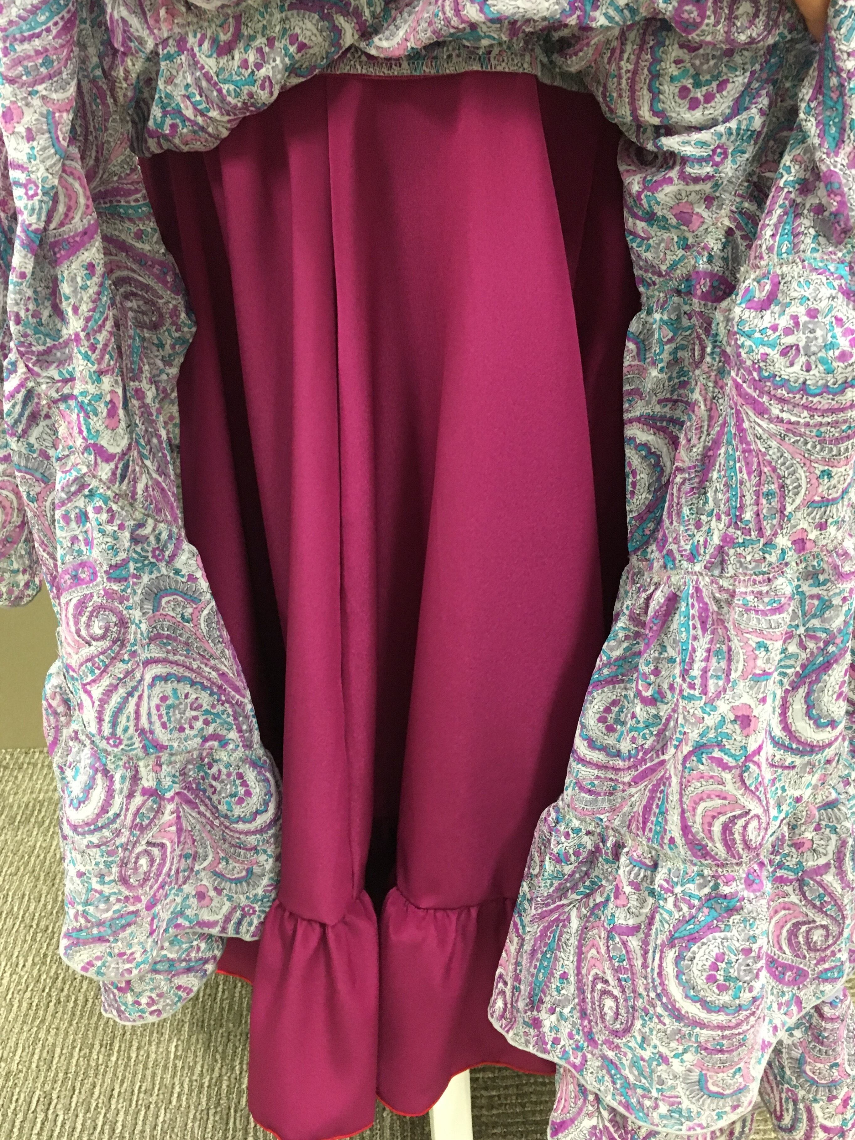 ワンピーススカート部分は、赤紫色ポリエステル生地の上にジョーゼットペイズリー柄生地を重ねております。